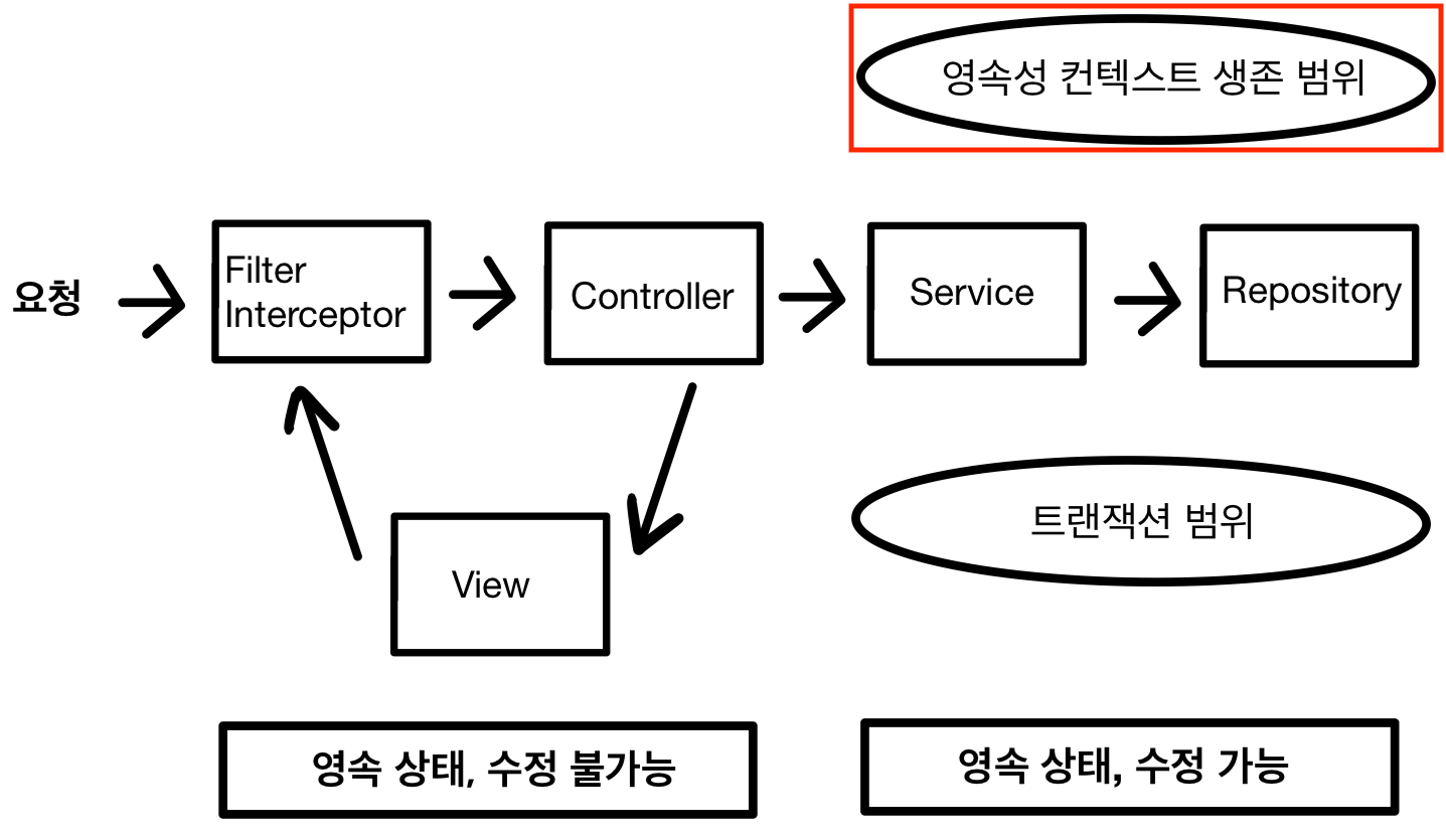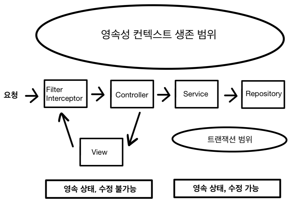 - 클라이언트의 요청이 들어오면 서블릿 필터나, 스프링 인터셉터에서 영속성 컨텍스트를 생성하지만, 이때 트랜잭션은 시작하지 않는다.