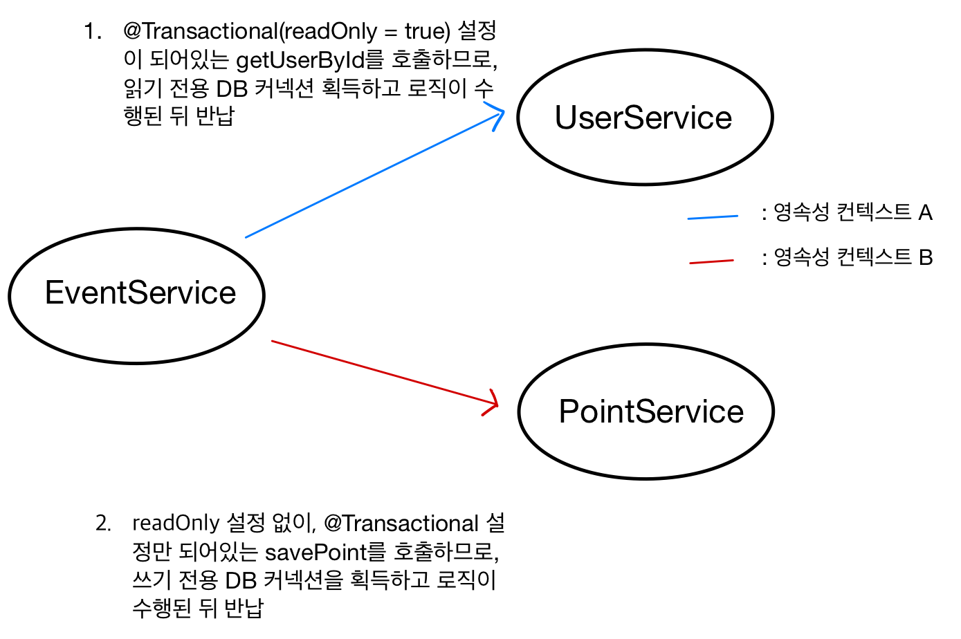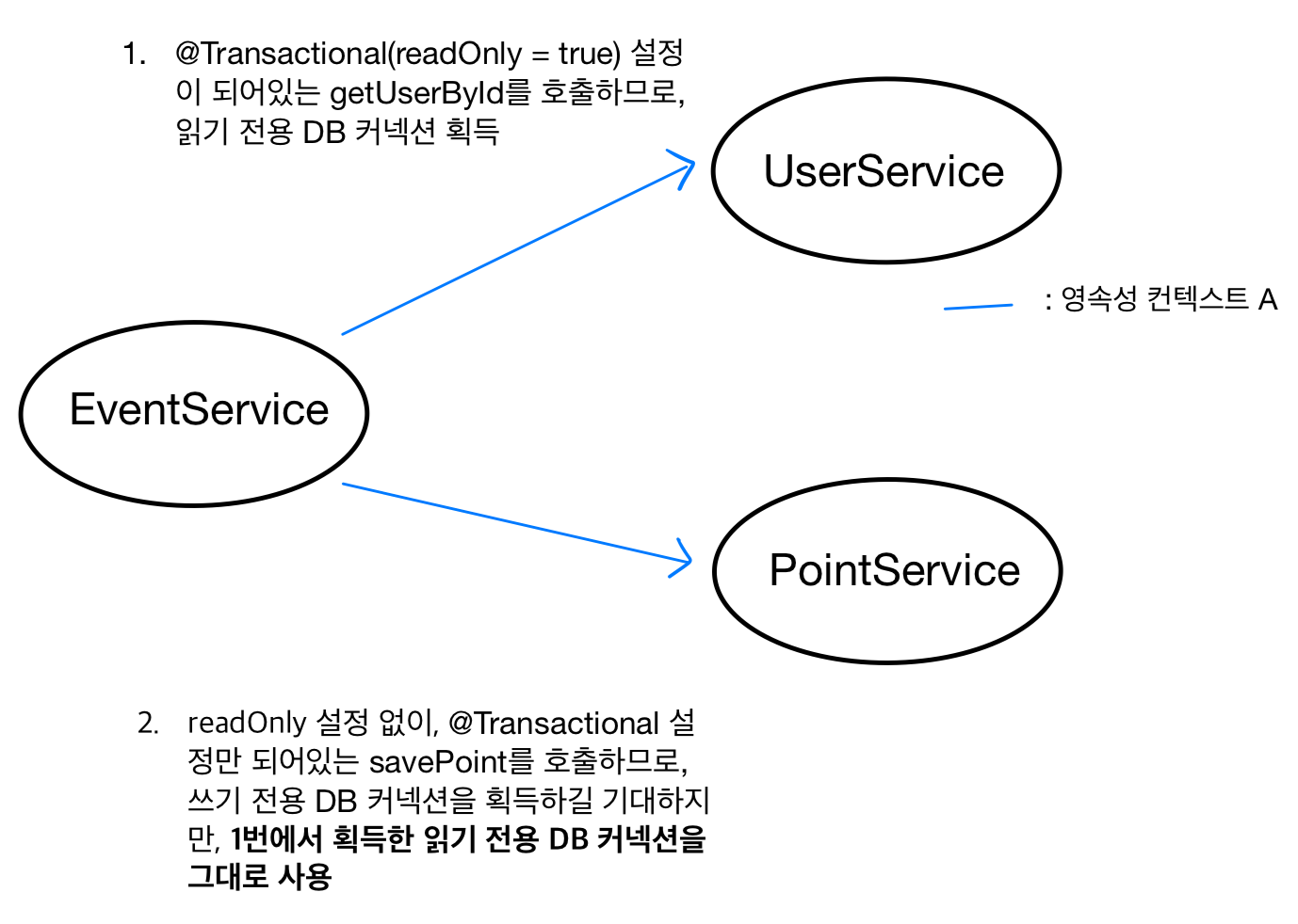 UserService의getUserById를 수행할 때는 읽기 전용 DB 커넥션,PointService의savePoint를 수행할 때는 쓰기 전용 DB 커넥션을 사용하여, 문제없이 로직이 수행될 수 있습니다.